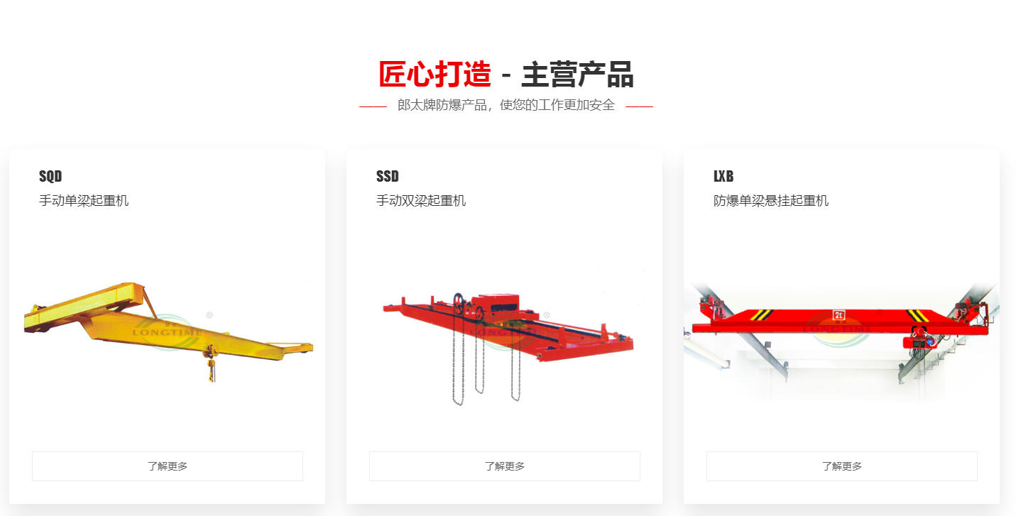 公司主要生产"郎太"牌系列起重产品,产品包括防爆、普通型电动单、双梁桥、门式起重机,欧式起重机,防爆型、普通型集装箱门式起重机,防爆型、普通型钢丝绳电动葫芦,防爆型、普通型环链电动葫芦,防爆型、普通型手动环链葫芦,防爆型、普通型升降平台,架桥机,提梁机,防爆电机,防爆电器等起重机配套产品,产品广泛应用于石油、化工、煤炭、机械、冶金、电力、铁路、港口等行业。公司生产的防爆起重产品品种齐全,取得防爆产品各类资质证书多项,覆盖整机及配套件产品。